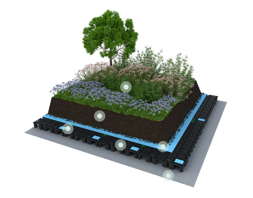 The connection between intensive green roofs and the sponge city concept is actually quite simple: a green roof creates many small storage spaces for water. Precipitation is retained and stays where it falls. Intensive green roofs also delay evaporation. The sponge city therefore absorbs water and releases it again with a delay. This improves the urban climate.