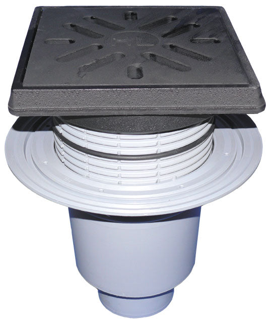 Perfect-drain DN110 vertical with flange, cut-to-size plastic extension 55 - 135 mm, cast iron grate frame 260 x 260 mm, cast iron grate 226 x 226 mm, strainer and frost- and drought-proof flap seal.