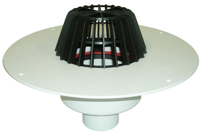 Flat-roof drain DN75-160 vertical with insulated drain body, PVC collar for perfect direct welding of PVC single ply material and domed plastic grate d 180 mm. Comes with lot cover.